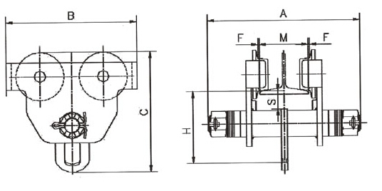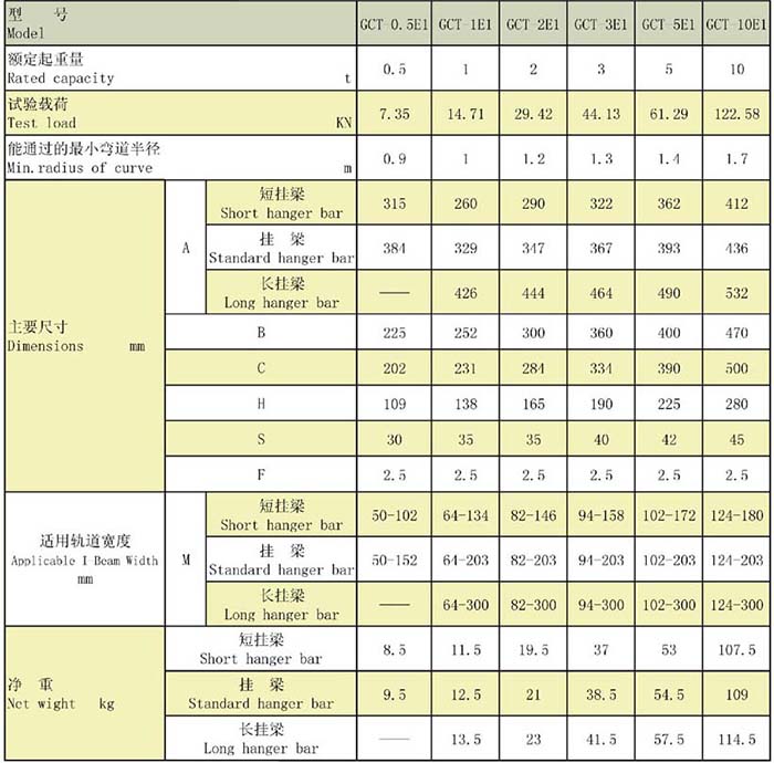 GCT-E1型手推单轨小车是一款新型的起重设备,作业适合用于工厂、矿山、码头、建筑工地都场合,非常适合用于无电源区作业。 |